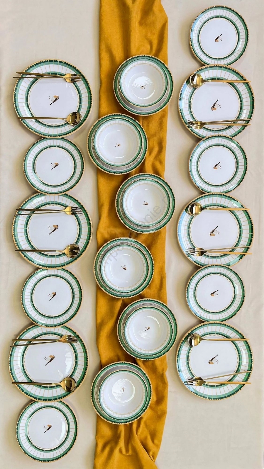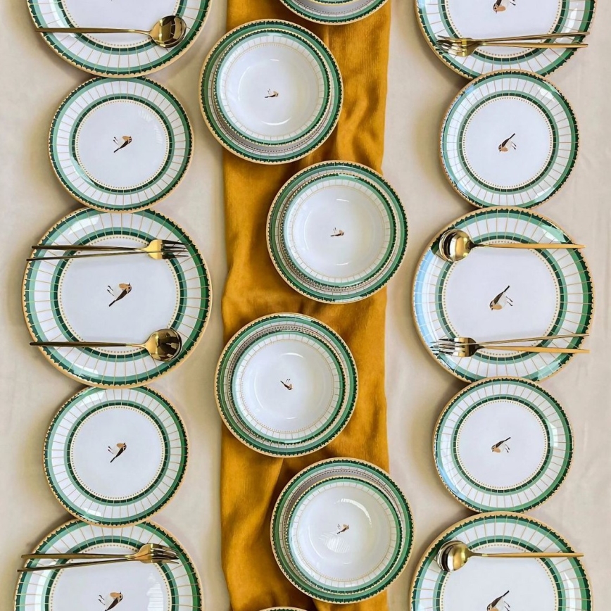24-delig servies, wit/groen/goud, keramiek