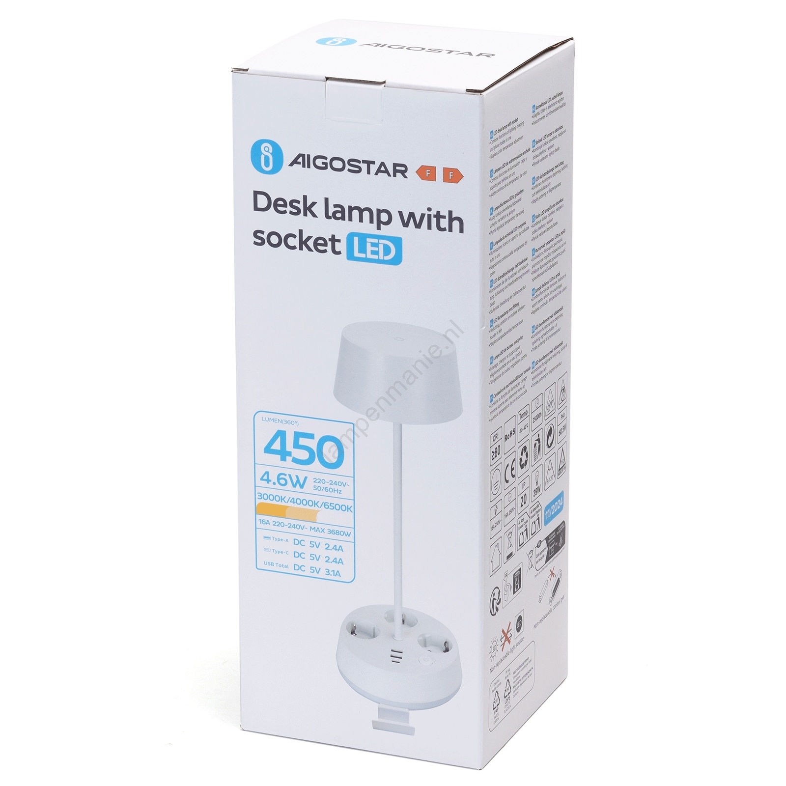 Aigostar - Dimbaar LED Bureau Lamp met Power Outlets en USB Port LED/4.6W/230V 3000/4000/6500K White