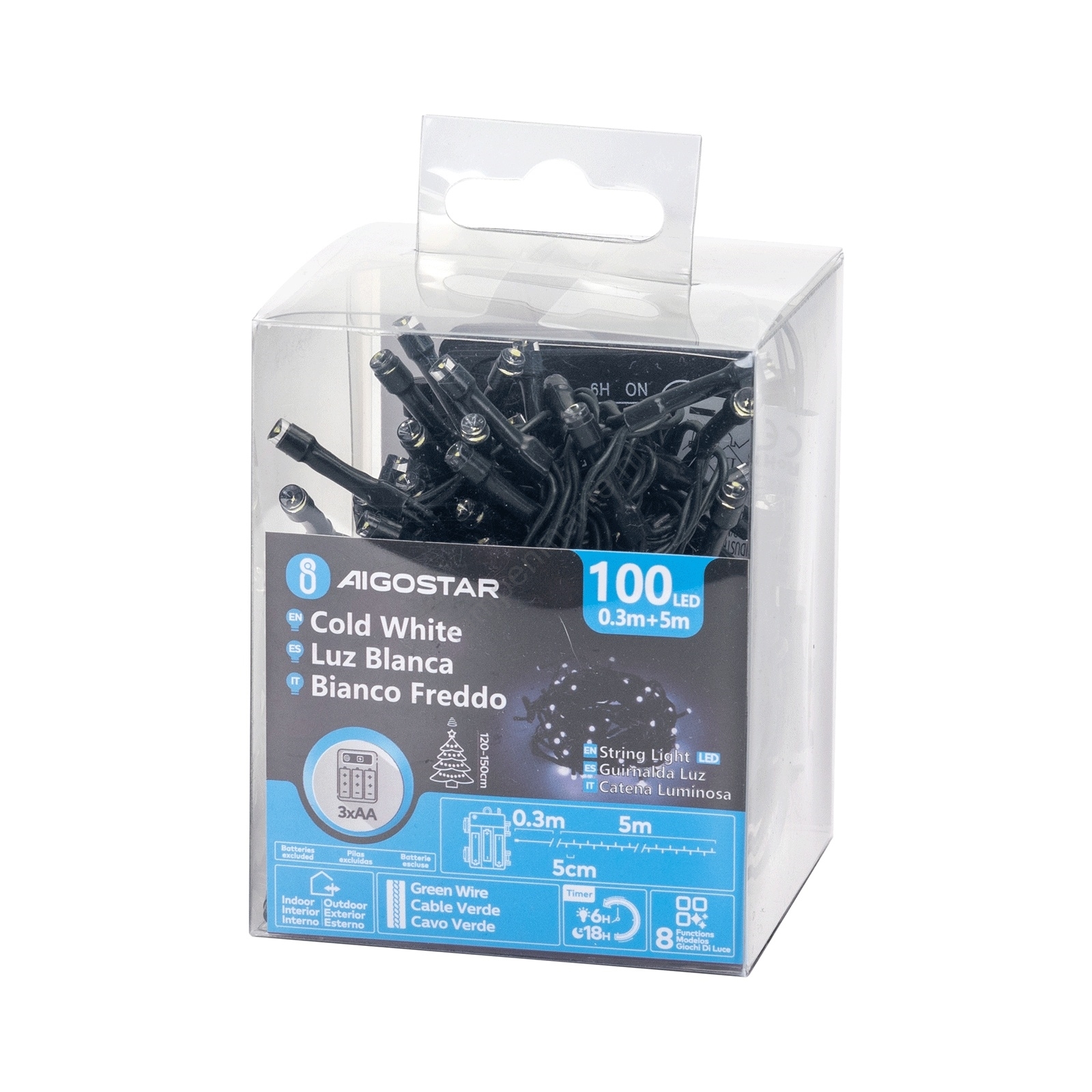 Aigostar - LED-kerstsnoer voor buiten, 100 LED, 8 functies, 3x AA, 5,3 m, IP44, koelwit