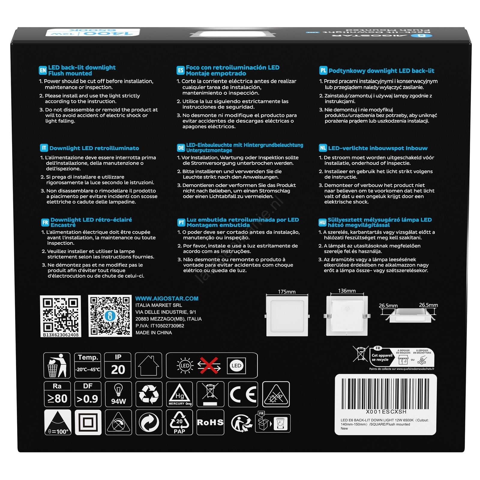 • Aigostar - LED inbouwarmatuur LED/12W/230V 6500K 17,5x17,5 cm wit