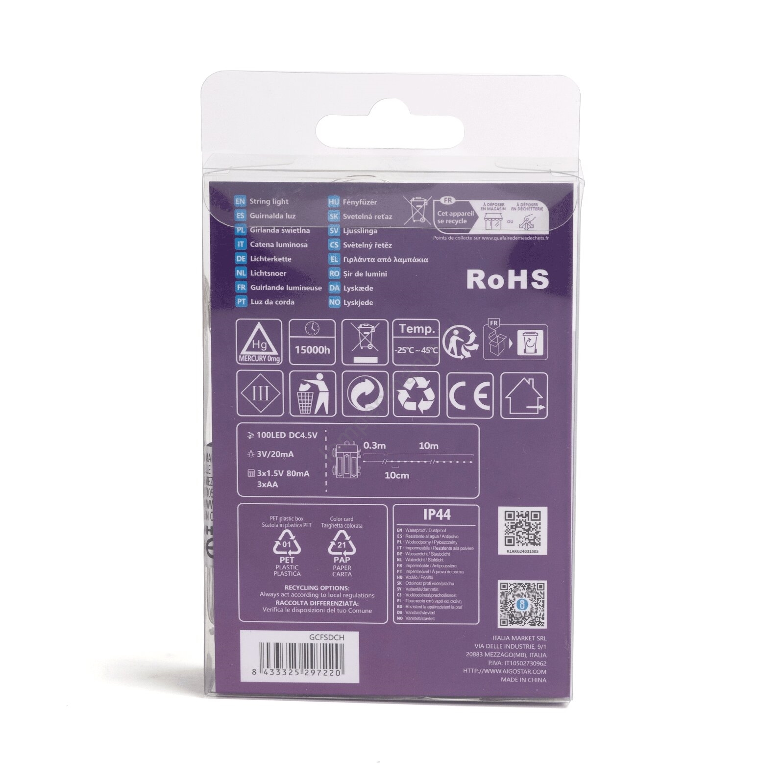 • Aigostar - LED-buitenlichtsnoer, 100 LED / 8 functies, 3×AA, 10,3 m, IP44, warm wit