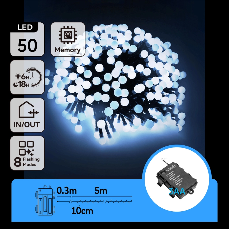 • Aigostar -LED Kerst lichtsnoer voor buiten 50xLED/8 Functies 3xAA 5,3m IP44 koud wit