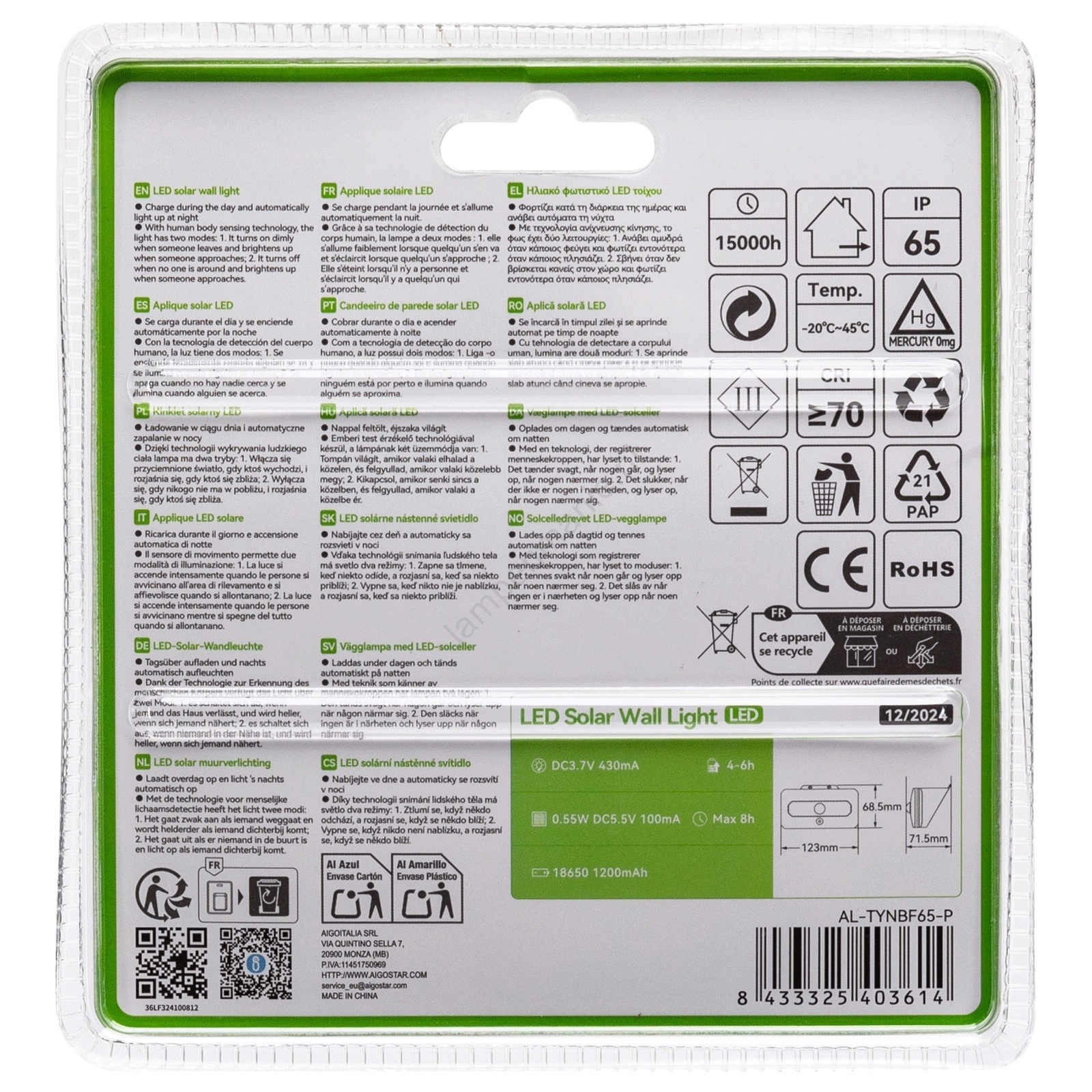 Aigostar - LED Solar Lamp met Sensor LED/3.7V 6500K 500 mAh IP65 zwart