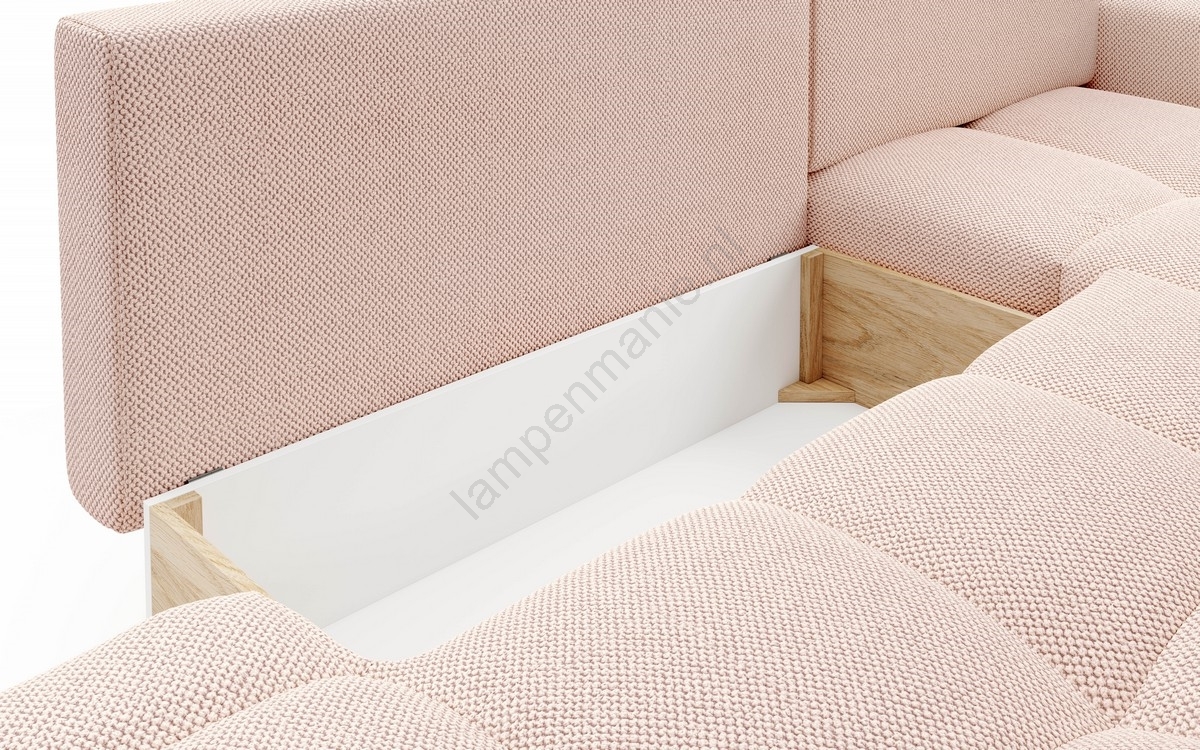 • Uitklapbare gestoffeerde hoekbank in L-vorm met opbergruimte ALMADA links roze