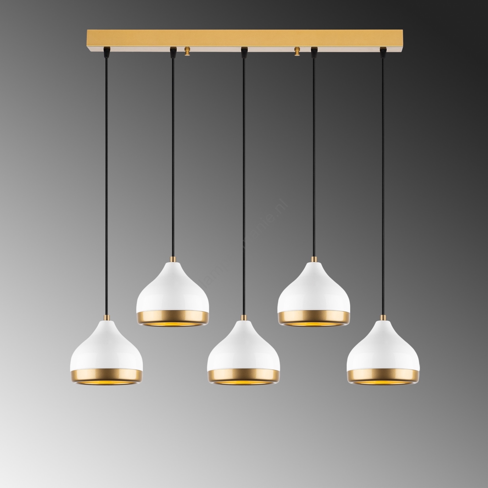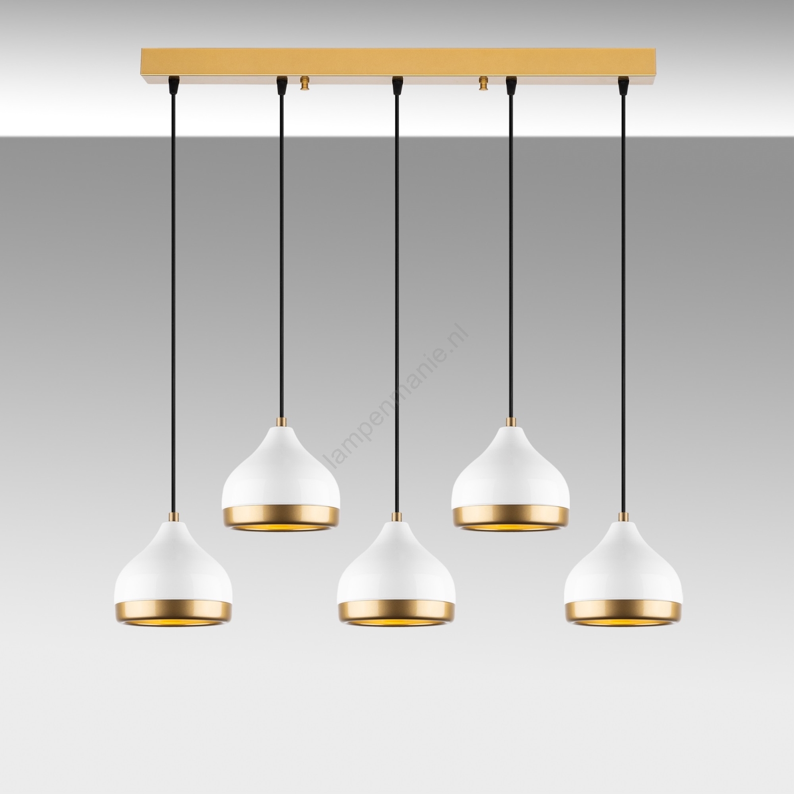 Hanglamp aan kabel YILDO 5xE27/40W/230V wit/goud kenmerkt een mooi en functioneel ontwerp.  Voor het licht is een lamp met E27 fitting geschikt. Hier kunt u andere lampen tegen voordelige prijzen kopen. U heeft een interessante aanwinst voor uw woning.