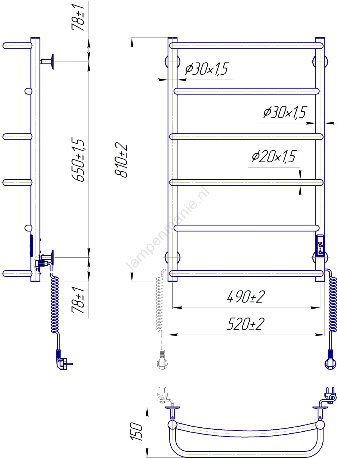 Handdoekradiator LUX 105W/230V 81x52 cm roestvrij staal/zwart, rechts