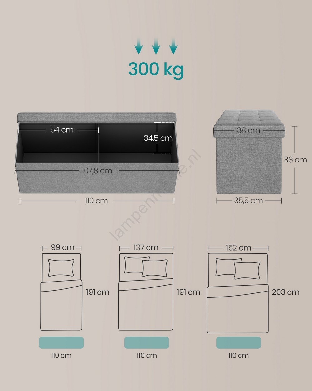 • Binnenin is er ruimte (140 l) om kleding, speelgoed, dekens en andere spullen op te bergen.