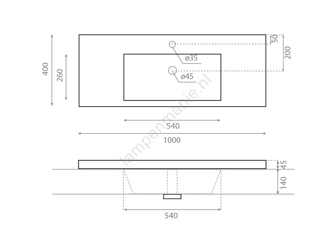 • De wastafel kan gedeeltelijk onder het aanrechtblad worden gemonteerd.