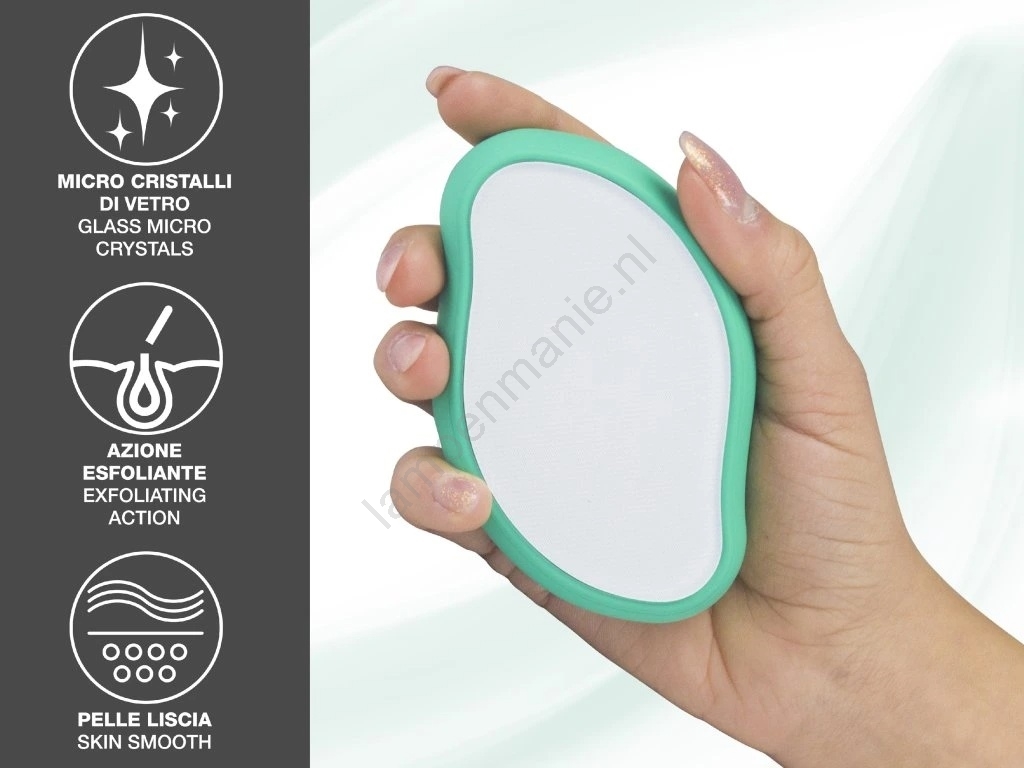 • Dit praktische hulpmiddel maakt gebruik van speciaal ontwikkelde glazen microkristallen die zorgen voor een zachte maar effectieve verzorging, terwijl de steen zelf slechts 80 gram weegt.