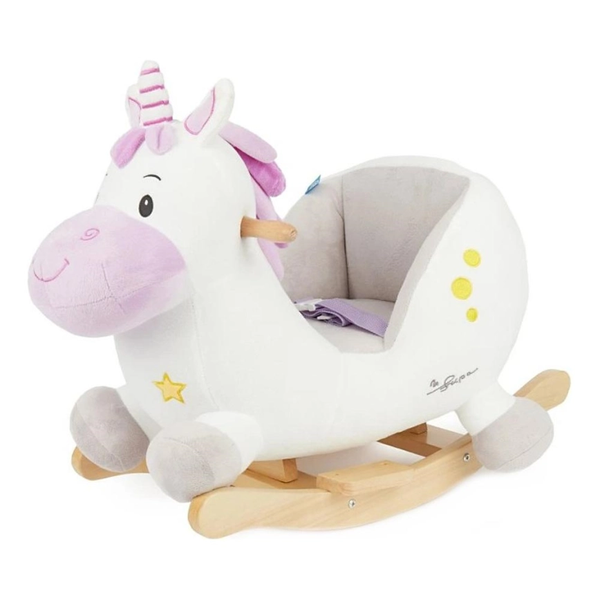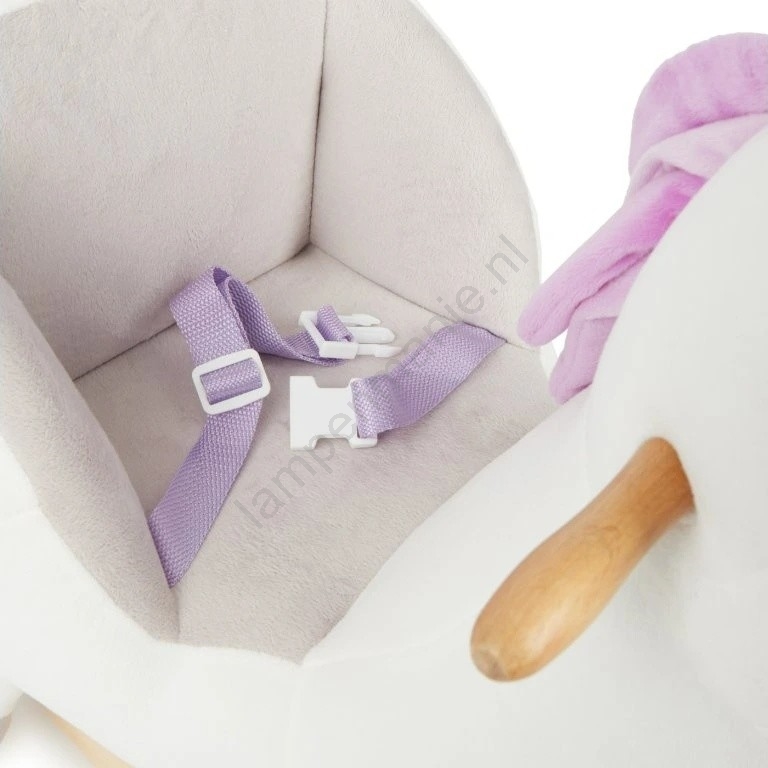 • De eenhoorn is uitgerust met een zacht, comfortabel gewatteerd zadel met veiligheidsgordel, die maximale comfort en bescherming biedt, zelfs voor de allerkleinsten.