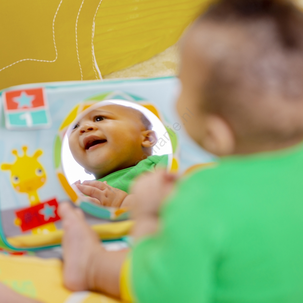 • De multisensorische ontwikkeling wordt gestimuleerd door geïntegreerde elementen zoals een veilig spiegeltje, kleurrijke Taggies-lintjes en knisperende vlaggetjes.