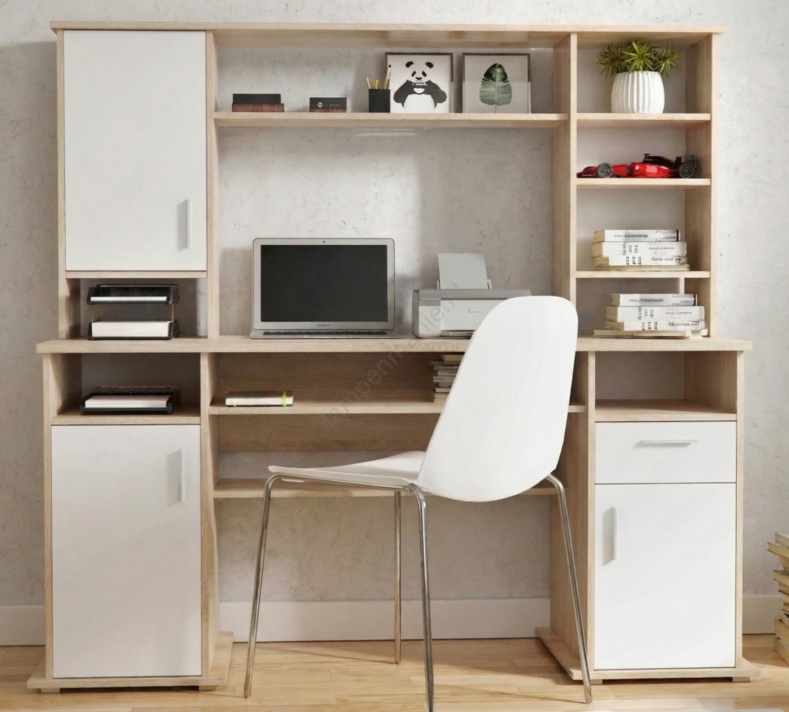 • Het bovenste gedeelte biedt extra planken voor boeken, decoratie of kantoorbenodigdheden, waardoor het ideaal is voor werkruimtes die functionaliteit en organisatie vereisen.