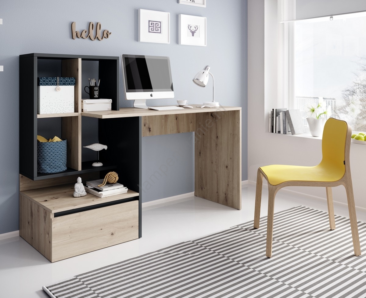 • Het rechthoekige werkblad wordt ondersteund door een zijplank met twee open vakken, ideaal voor het opbergen van boeken, kantoorbenodigdheden of decoratie.