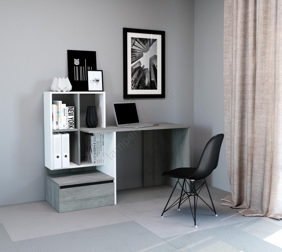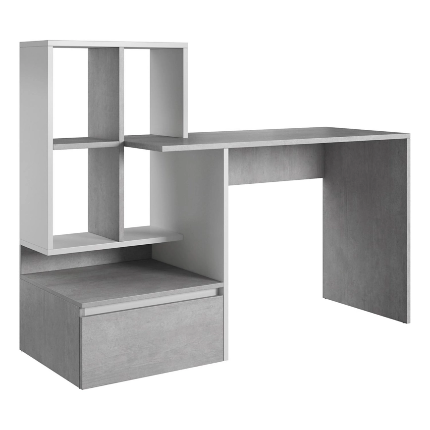 • Het rechthoekige werkblad rust op een zijplank met twee open planken, ideaal om boeken, kantoorartikelen of decoraties in op te bergen.