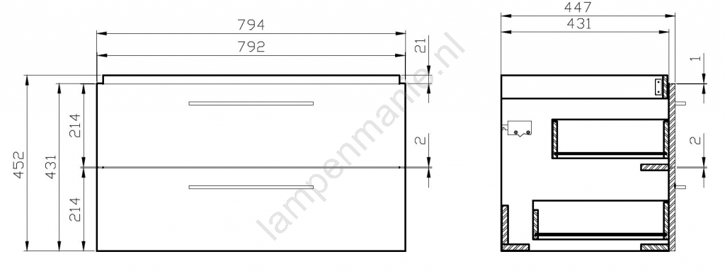 • Het front en de kast zijn gemaakt van 16 mm spaanplaat met een witte lakafwerking.