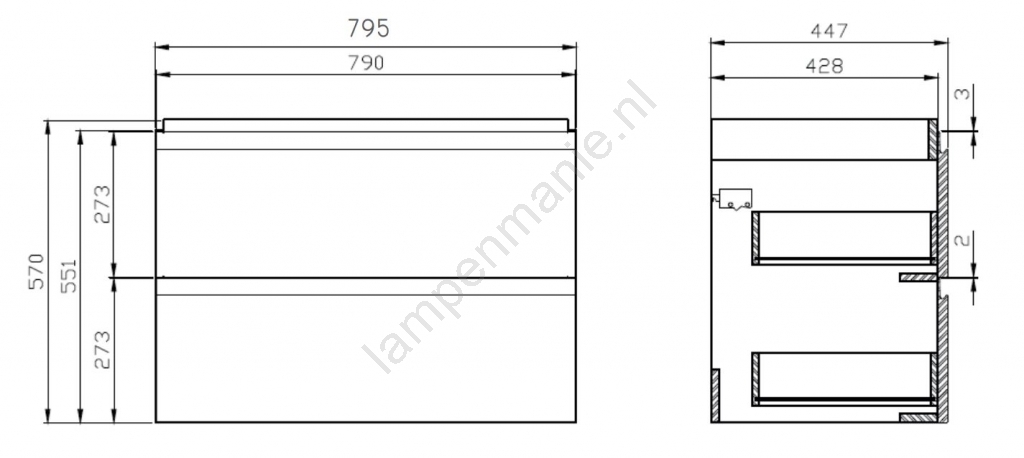 • De kast heeft twee ruime lades met softclose en verborgen handgrepen.