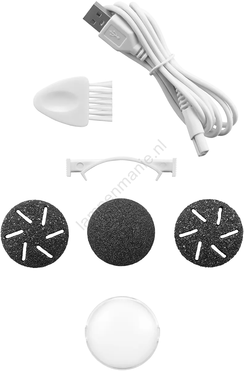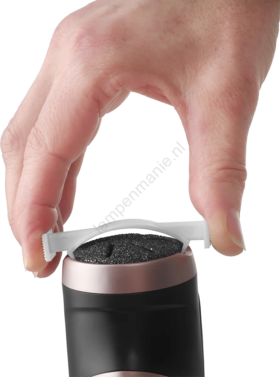 • De roterende schuurkop verwijdert veilig droge en verharde huid, die er onaantrekkelijk uitziet en bovendien kan leiden tot huidbarsten, likdoorns en drukplekken.