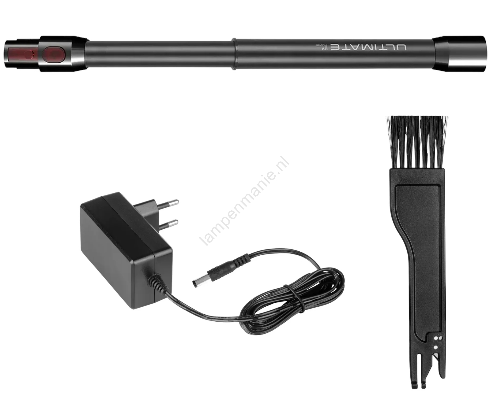 • Accessoires in de verpakking: Flexibel gebogen opzetstuk bovenaan de stofzuiger, kleine UVC-turboborstel, HardFloor-borstel, Tapijtborstel, flexibele flexslang, spleetmondstuk, spleetmondstuk met borstel, meubelmondstuk, voedingsadapter.