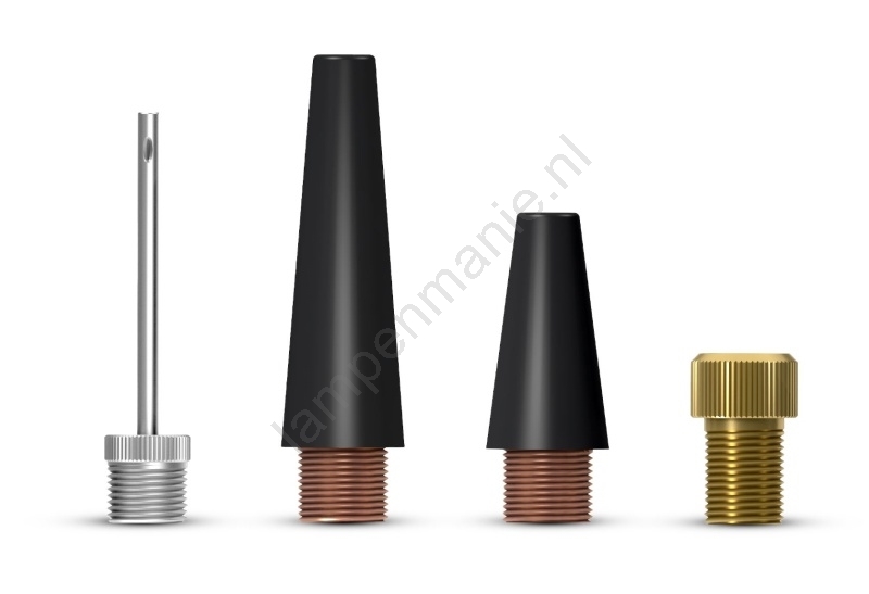 • 4 adapters in verschillende maten: adapter voor Franse (Presta) ventielen, naaldadapter voor ballen, korte conische adapter, lange conische adapter.