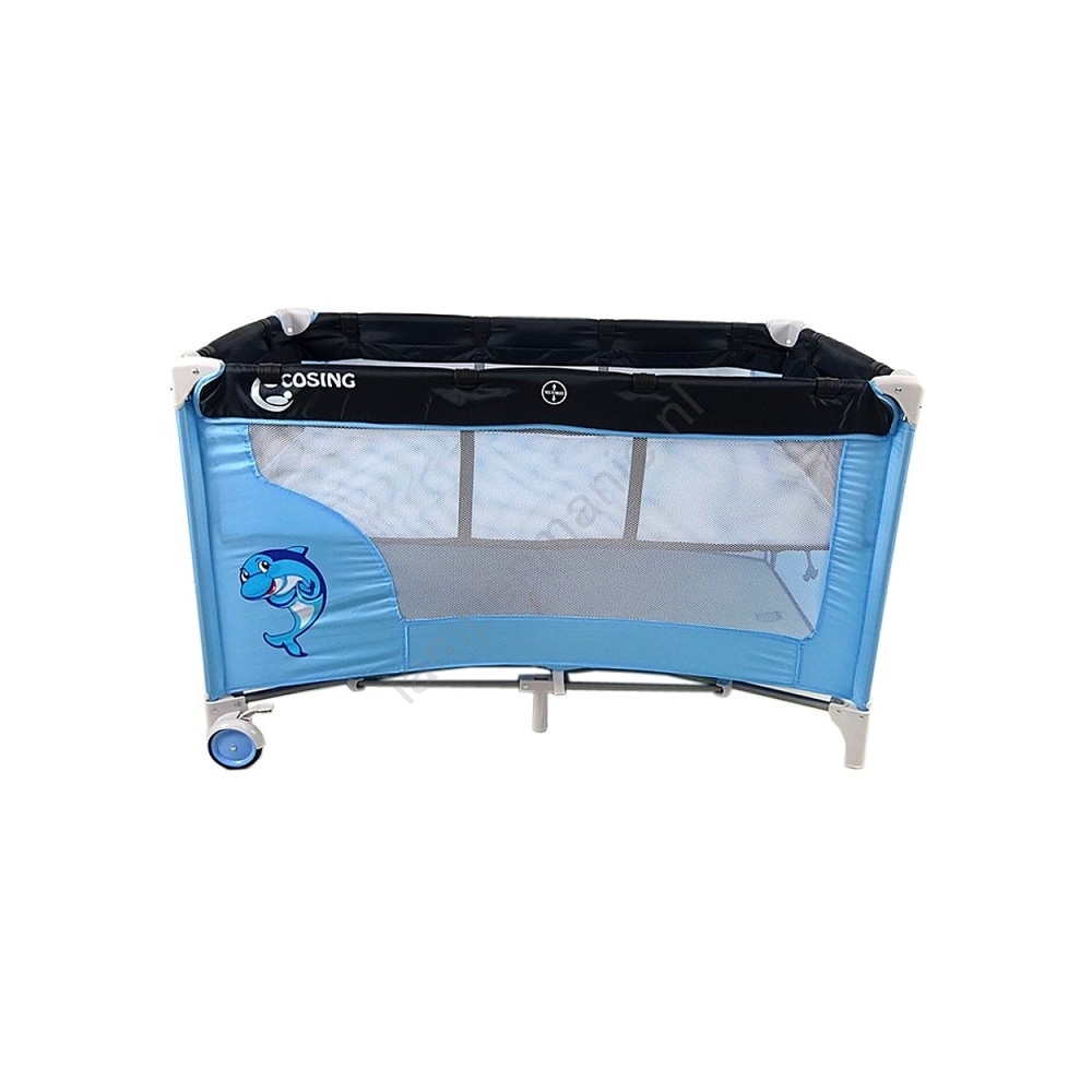 • Het reisbed is uitgerust met een opvouwbare matras, wieltjes met rem en een zij-ingang met ritssluiting.