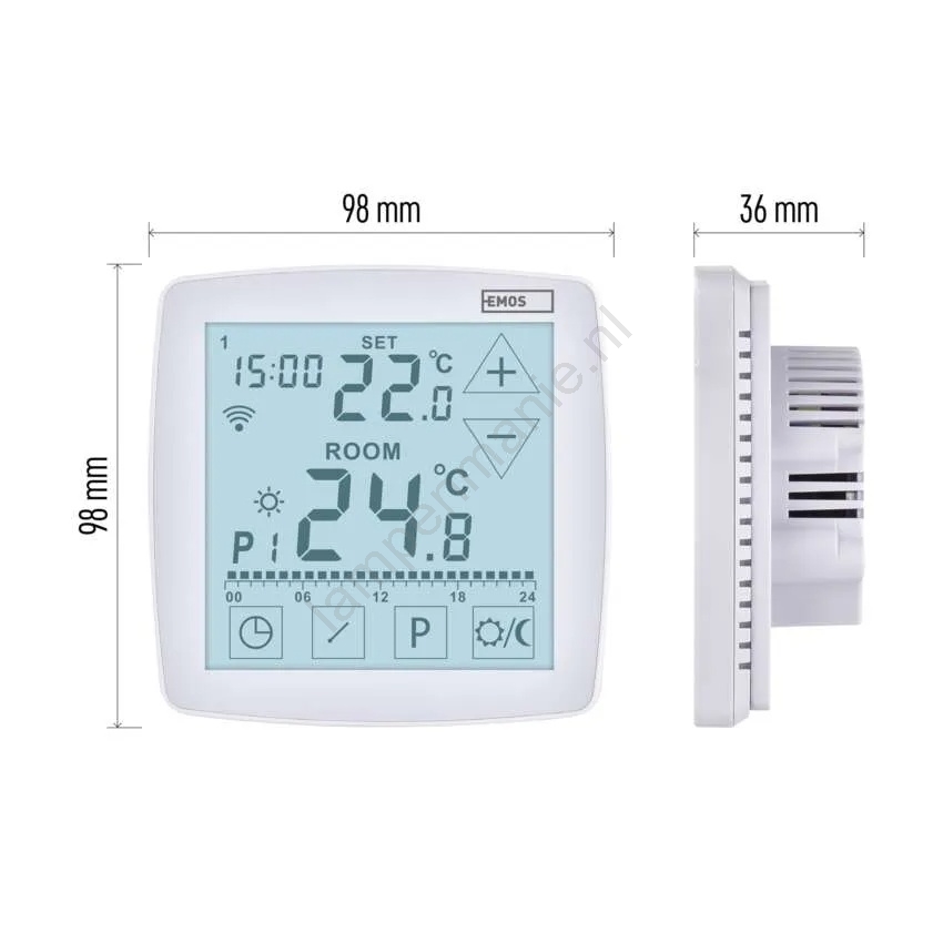 • Programmeerbare bekabelde thermostaat bestemd voor de regeling van vloerverwarming (en koelsysteem) met WiFi-verbinding — ideaal voor digitale slimme woningen.Programmeerbare bekabelde thermostaat bestemd voor de regeling van vloerverwarming (en koelsysteem) met WiFi-verbinding — ideaal voor digitale slimme woningen.