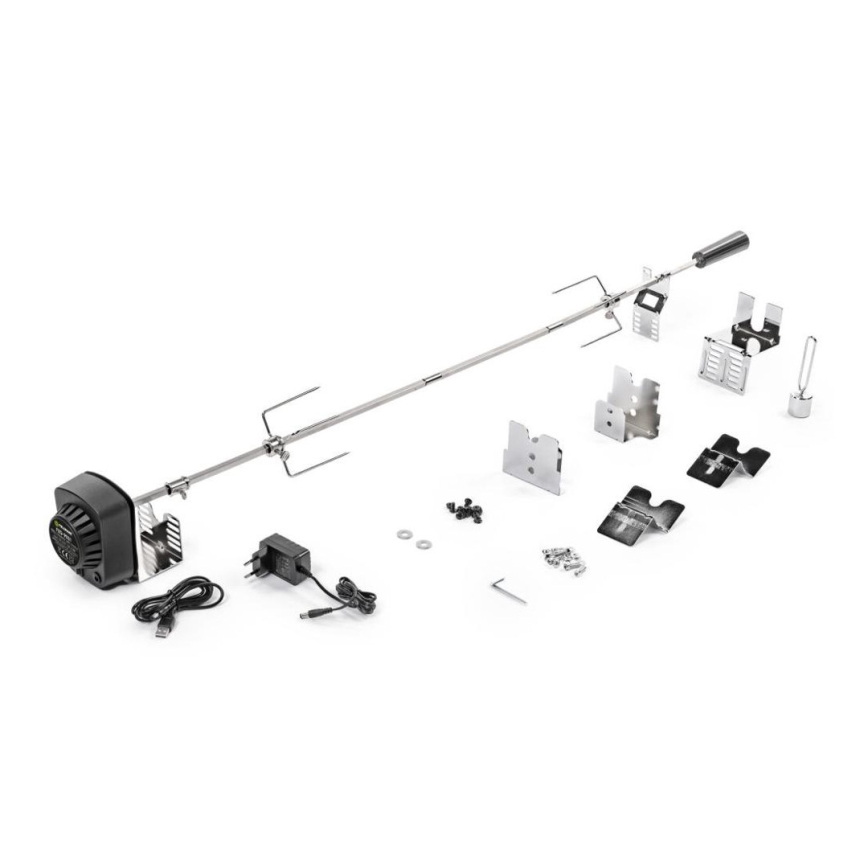 • Praktische roestvrijstalen rotisserie-spies met elektrische motor garandeert een gelijkmatige draaiing van het vlees.