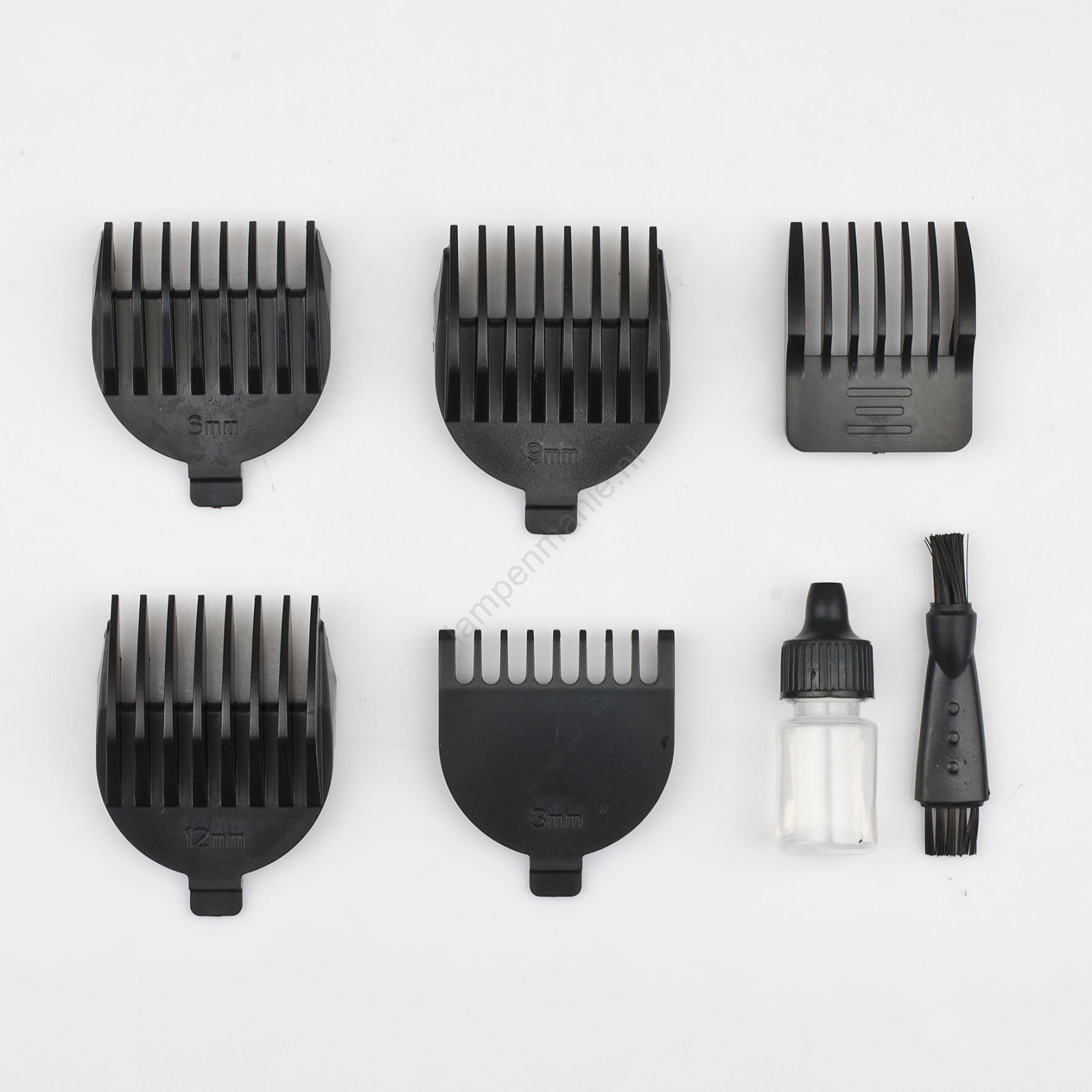 • Het pakket bevat 4 opzetkammen voor het knippen van haar, 1 kam voor het trimmen van de baard, een reinigingsborsteltje en smeerolie.