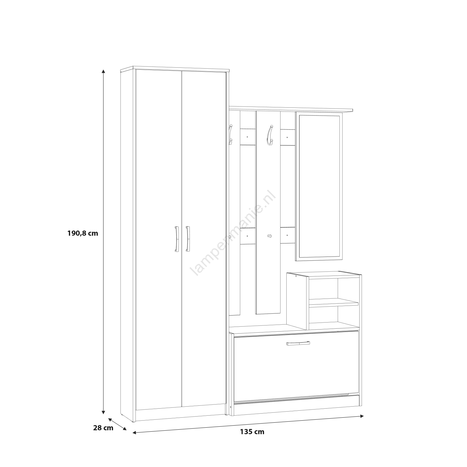 • Kast, planken, schoenenkast, haken en een grote spiegel bieden precies wat u nodig heeft.