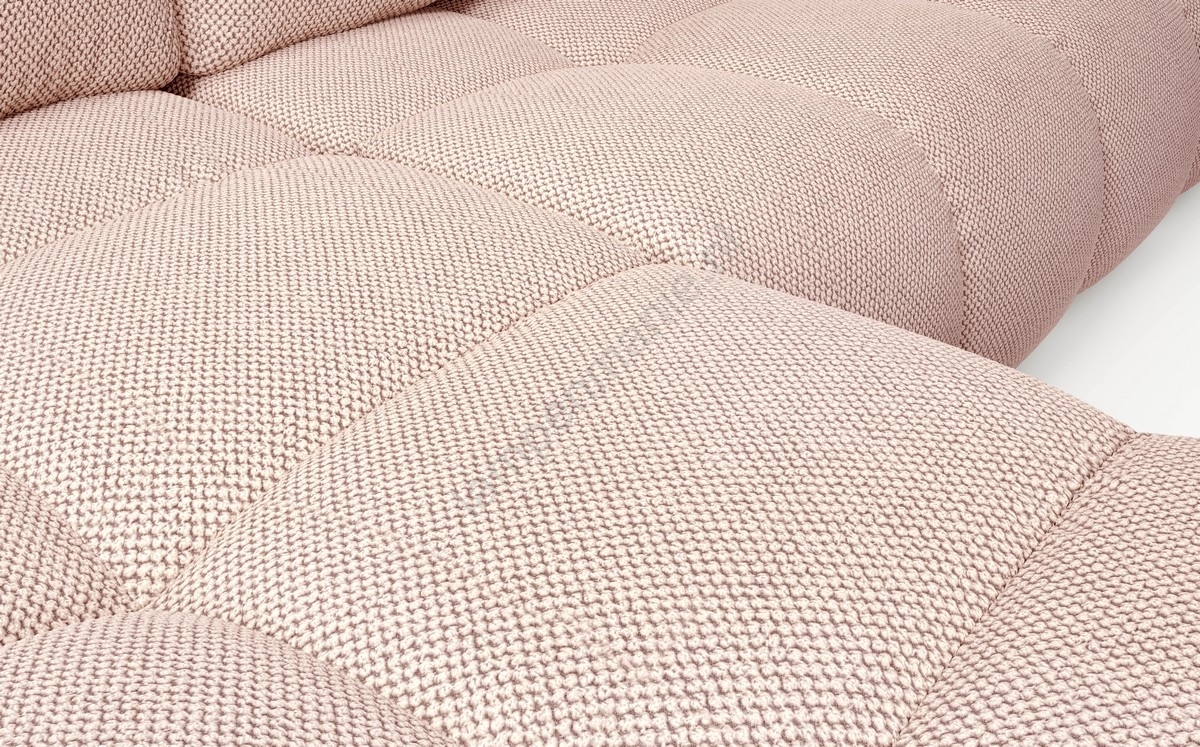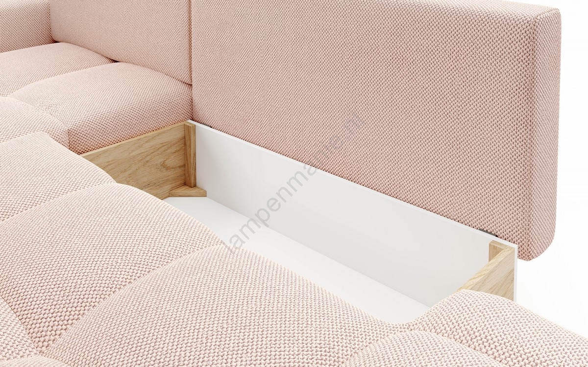 Uitklapbare gestoffeerde hoekbank in L-vorm met opbergruimte ALMADA links roze