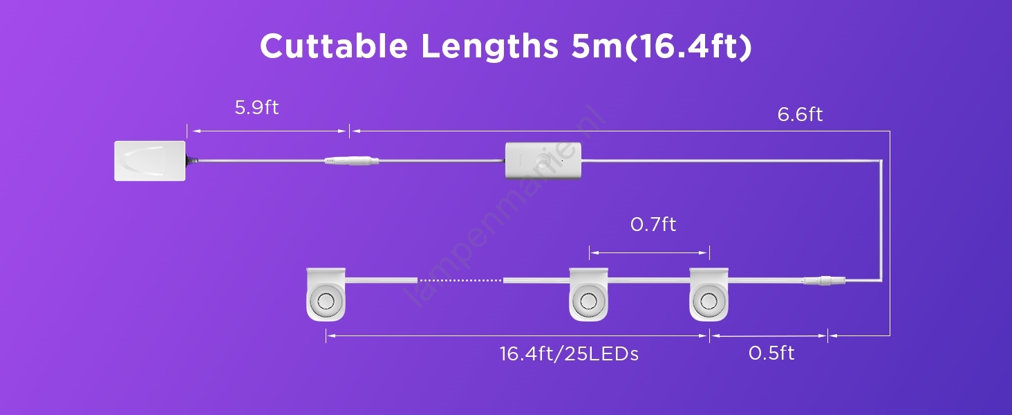 • Een ketting van 25 onafhankelijk programmeerbare LED-lampjes, verdeeld over een lengte van 5 meter, verandert een saaie muur in een groot RGB-kunstwerk.