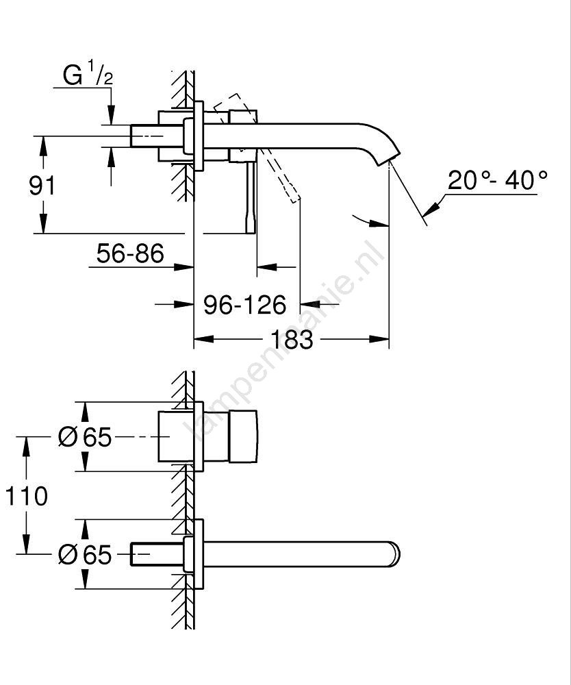 • De afstand tussen het midden van de kraan en de uitloop is 110 mm, de uitlooplengte bedraagt 183 mm.