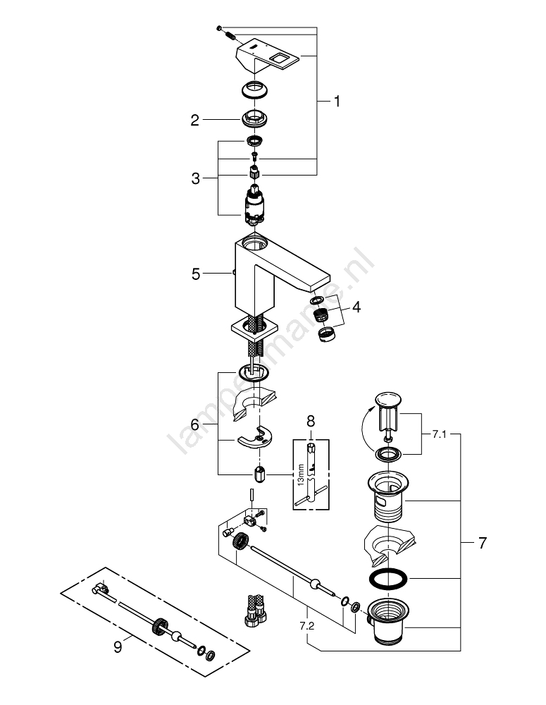 • Moderne eengreeps wastafelkraan GROHE Eurocube met strak, hoekig design.