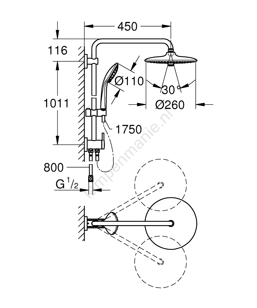 • Horizontale draaibare douchearm van 450 mm voor flexibele positionering.