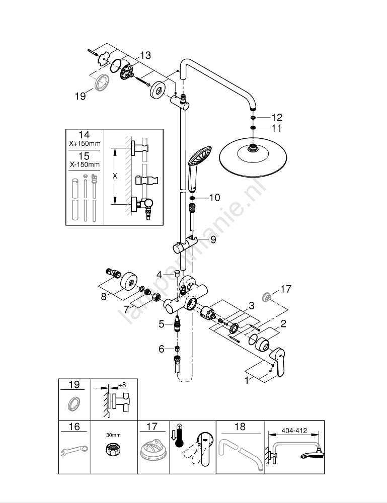 • Horizontaal draaibaar douchearm van 450 mm voor flexibele positionering van de hoofddouche.