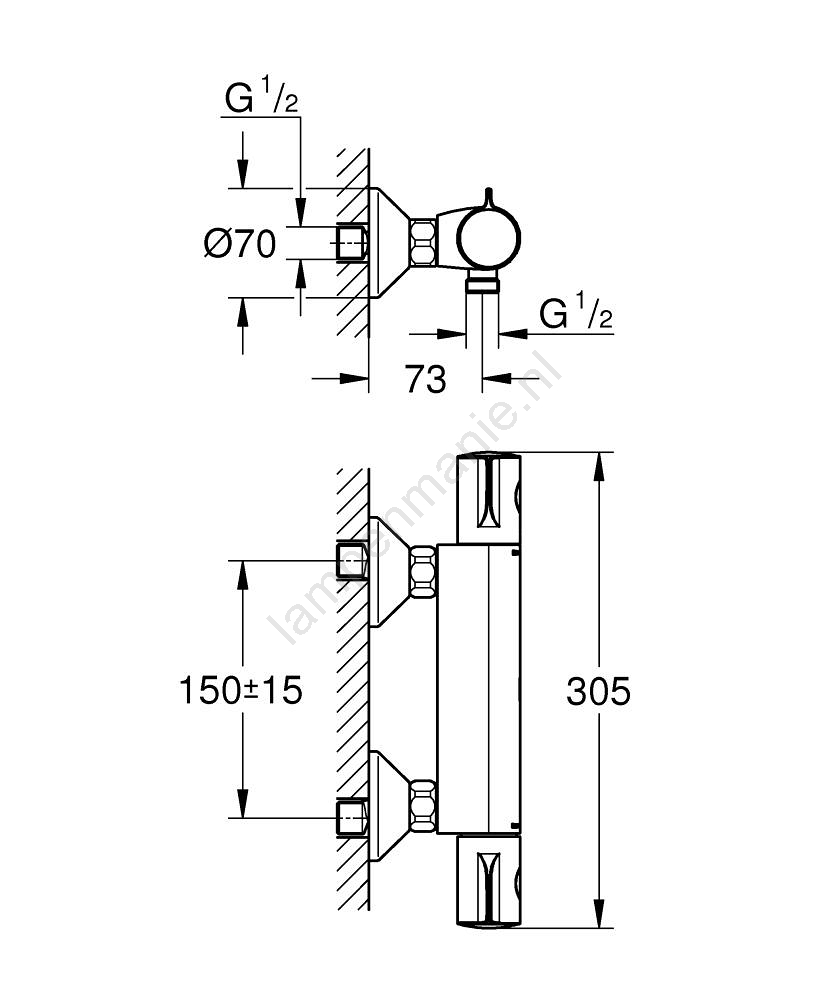• Wandgemonteerde thermostatische douchemengkraan voor eenvoudige installatie.
