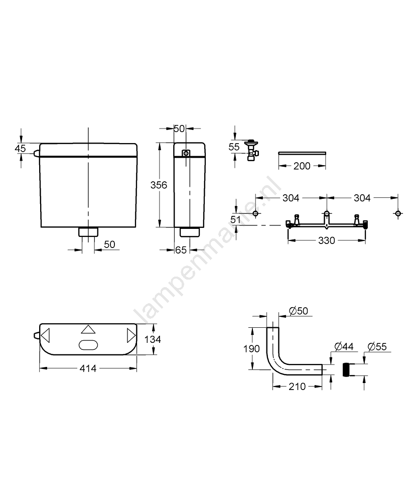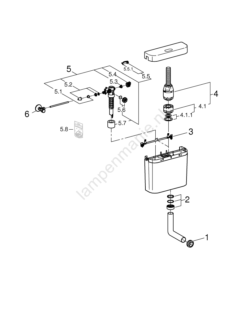 • Bocht van de spoelleiding en aansluitstuk voor de WC-inlaat voor complete montage.