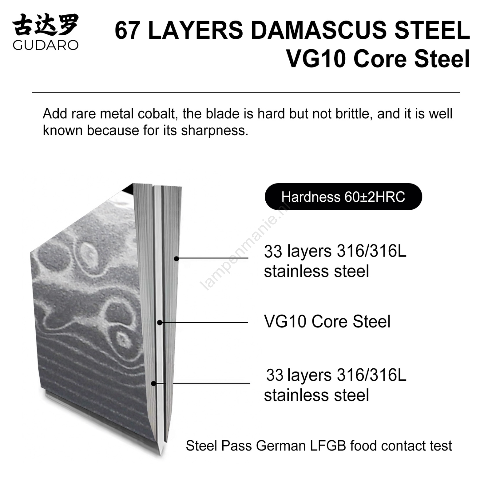 • Het lemmet bestaat uit 67 lagen damaststaal met een harde kern van VG10, wat zorgt voor extreme scherpte en langdurige stabiliteit van het snijvlak.