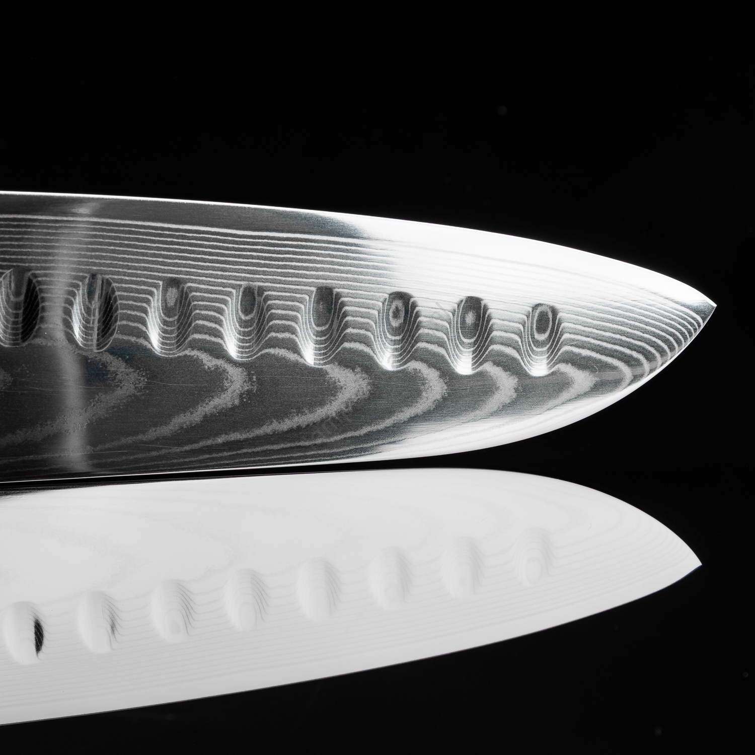 • Het lemmet van 175 mm bestaat uit 67 lagen damaststaal met een harde kern van VG10, die zorgt voor extreme scherpte en langdurige stabiliteit van het snijvlak.