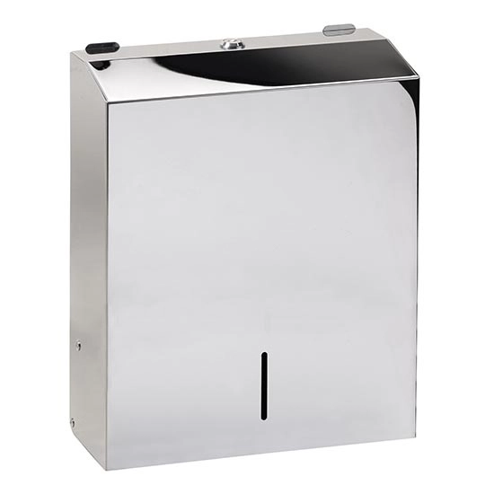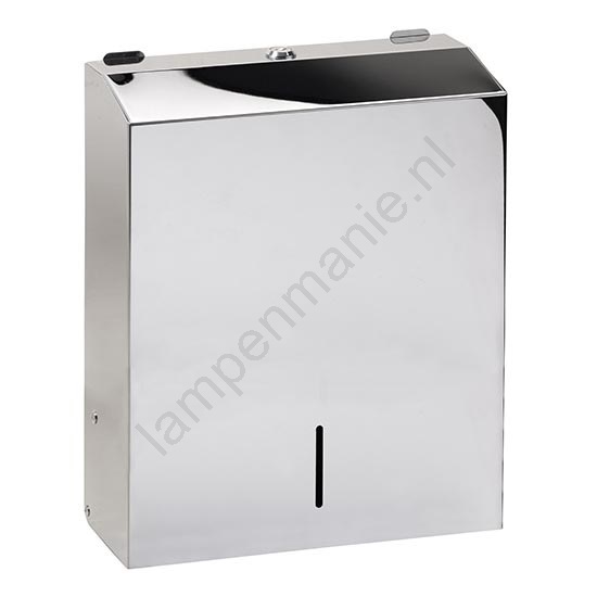 • Moderne dispenser voor papieren handdoeken van roestvrij staal met een glanzende afwerking.