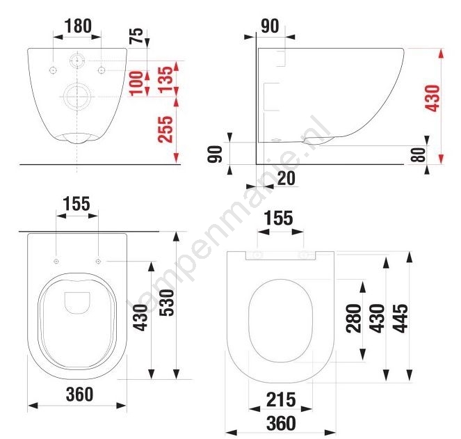 • Wandtoilet met diepe spoeling zonder spoelrand.