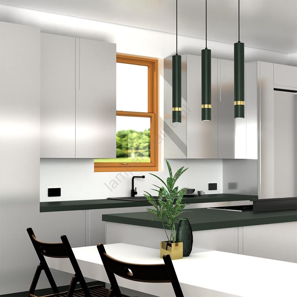 Hanglamp met kabel JOKER 3xGU10/25W/230V groen/goud kenmerkt een mooi en functioneel ontwerp.  Voor het licht is een lamp met GU10 fitting geschikt. Hier kunt u andere lampen tegen voordelige prijzen kopen. U heeft een interessante aanwinst voor uw woning.