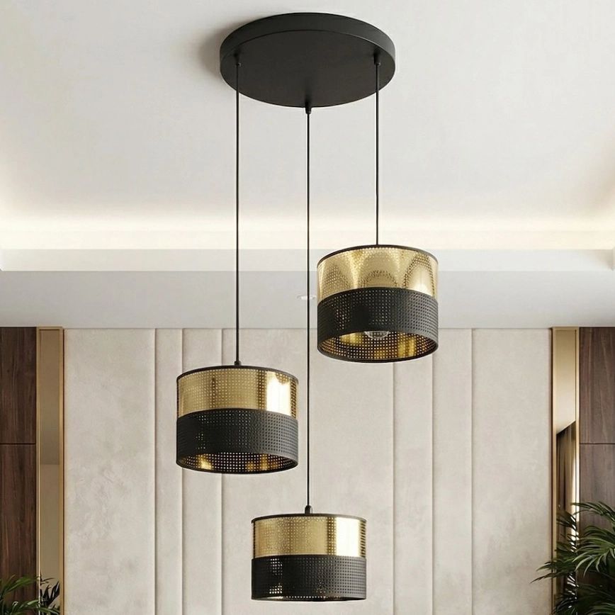 Hanglamp aan snoer LUX 3xE27/15W/230V zwart/goud kenmerkt een mooi en functioneel ontwerp.  Voor het licht is een lamp met E27 fitting geschikt. Hier kunt u andere lampen tegen voordelige prijzen kopen. U heeft een interessante aanwinst voor uw woning.