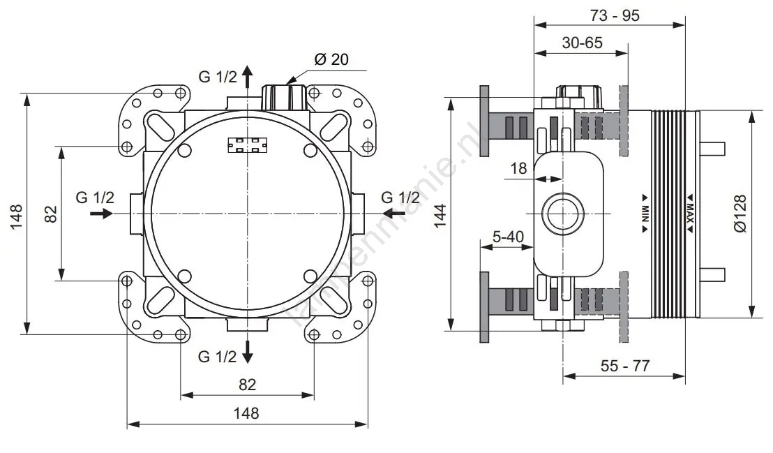 • De totale inbouwdiepte varieert tussen 73 en 95 mm, waarbij de verstelbare diepte 5 tot 40 mm bedraagt.