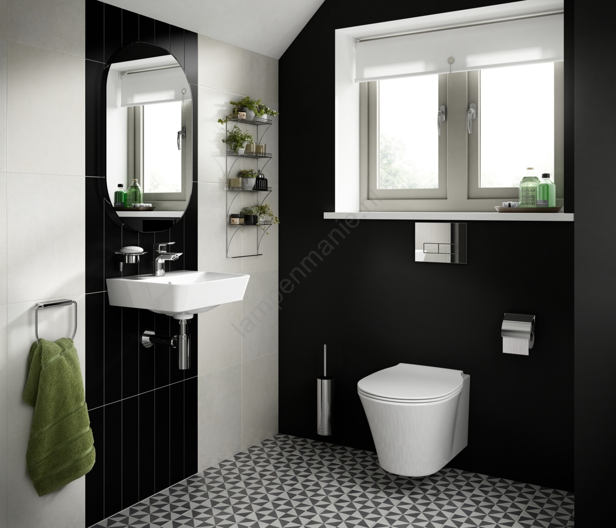 • Hangende wastafel Cube uit de Ideal Standard Connect Air‑serie is ontworpen in een eenvoudige, strakke stijl en ideaal voor krappe ruimtes, bijvoorbeeld toiletten.
