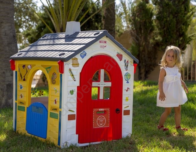 • Het huisje heeft 2 ramen en 2 toegangsdeuren (een kleine zijdeur en een hoofddeur met grendel en brievenbus).