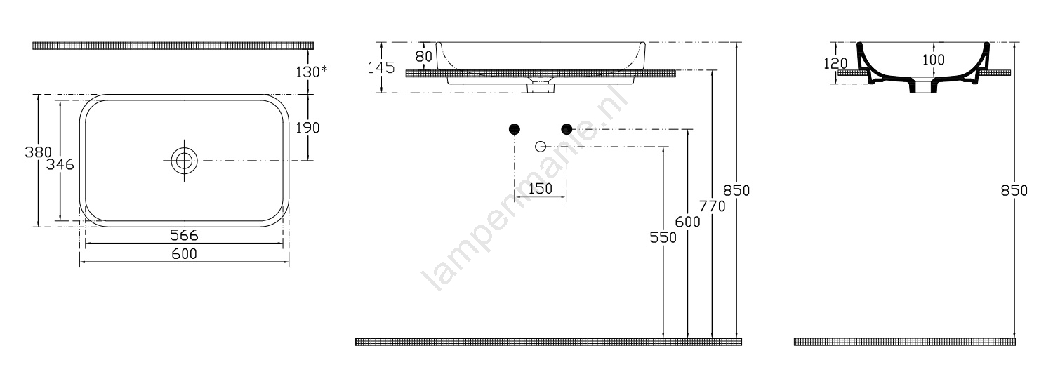 • De wastafel kan aan de wand worden opgehangen, op het werkblad geplaatst of in het blad ingebouwd.