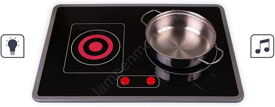 • Net als een echte keuken heeft het kookplaatje LED-verlichting en geluidseffecten: door op de rode knoppen te drukken, gaan de ringen van de kookplaat aan, en bij een tweede druk hoor je het geluid van kokend water.