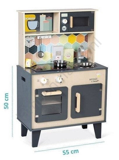 • De grote Mozaic keuken is gemaakt van hout en heeft een haak voor het ophangen van 1 soeplepel, 1 pan en 1 metalen vergiet, plus 3 kartonnen dozen voor voedsel (kaas, bloem, rijst).