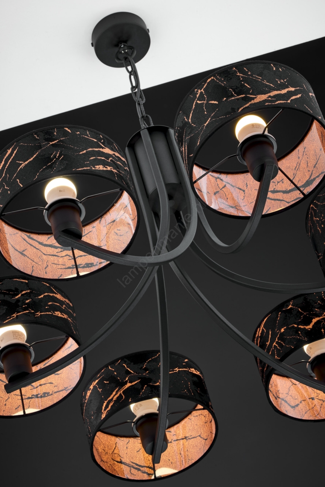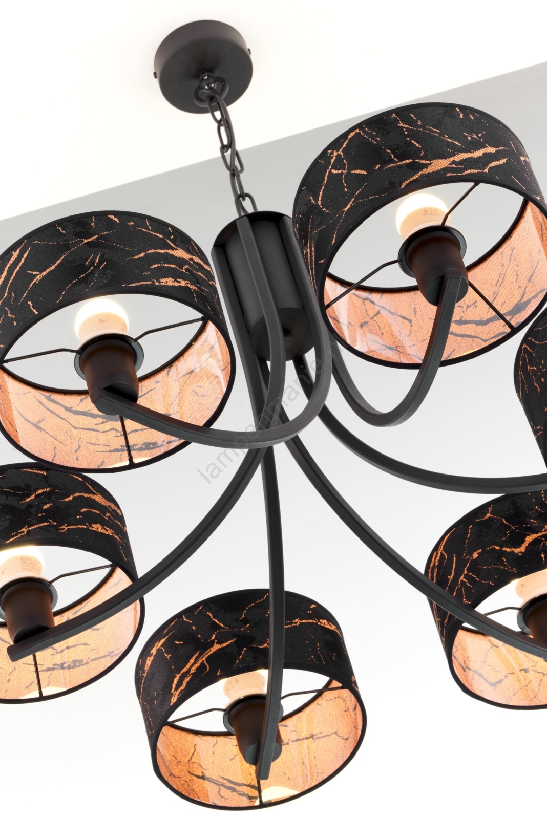 Jupiter 2108 - Kroonluchter aan ketting ARTHUR 6xE27/15W/230V zwart/oranje/marmerdecor kenmerkt een mooi en functioneel ontwerp.  Voor het licht is een lamp met E27 fitting geschikt. Hier kunt u andere lampen tegen voordelige prijzen kopen. U heeft een interessante aanwinst voor uw woning.