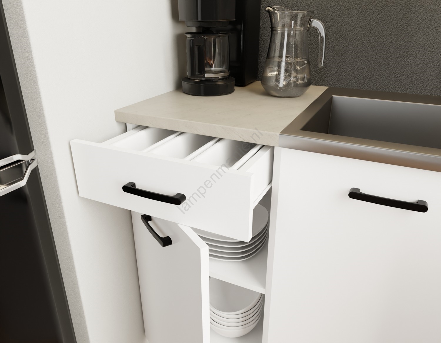 • De kastindeling is modulair, u kunt de keuken naar uw eigen wensen aanpassen.